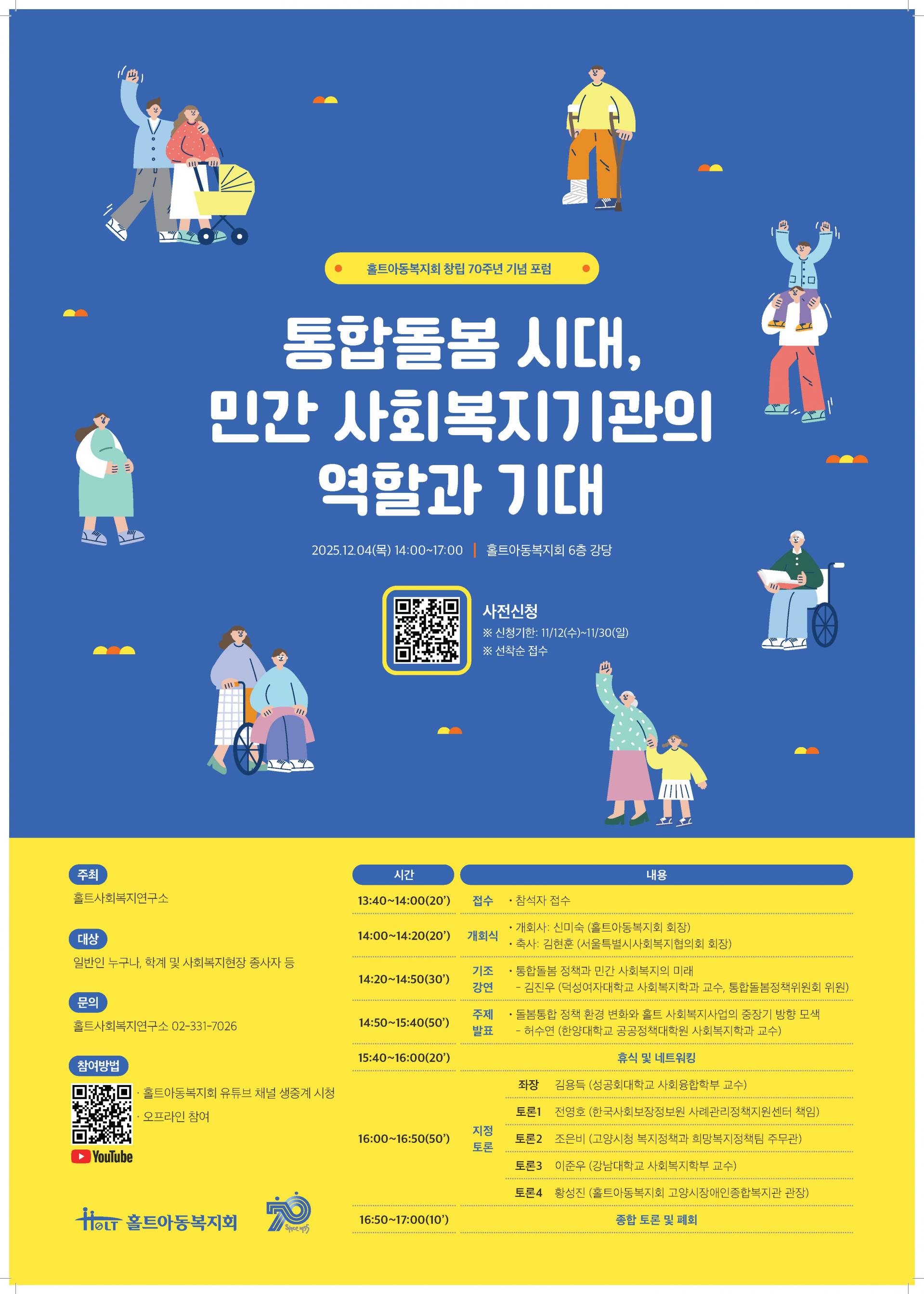 홀트아동복지회에서 "통합돌봄 시대, 민간 사회복지기관의 역할과 기대"를 주제로 창립 70주년 기념 포럼을 개최합니다.
